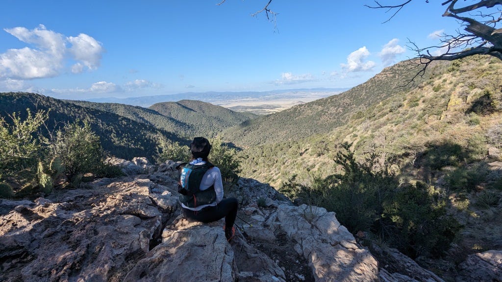 I met up with a few awesome women and stuck with them for a bit (one even knew a friend of mine from Philly!!). The water drops were surprisingly decked out with ice towels and popsicles and I was feeling good. Then I bumped into another woman, Kristin, and we kept pace with each other for quite some time. While there wasn’t much cell service in this section, she had a satellite device that allowed her to message with her husband from time to time. Turns out her husband had been hanging with my crew for most of the day! She graciously messaged my crew for me to check in and say hi! This was such a needed boost. We spent many miles and hours praising the wind gusts, problem solving a frozen water pack, filtering stream water, helping a few other folks having issues along the trail, bonding over both being OTs (!!), and chatting about the donkey racing she does.